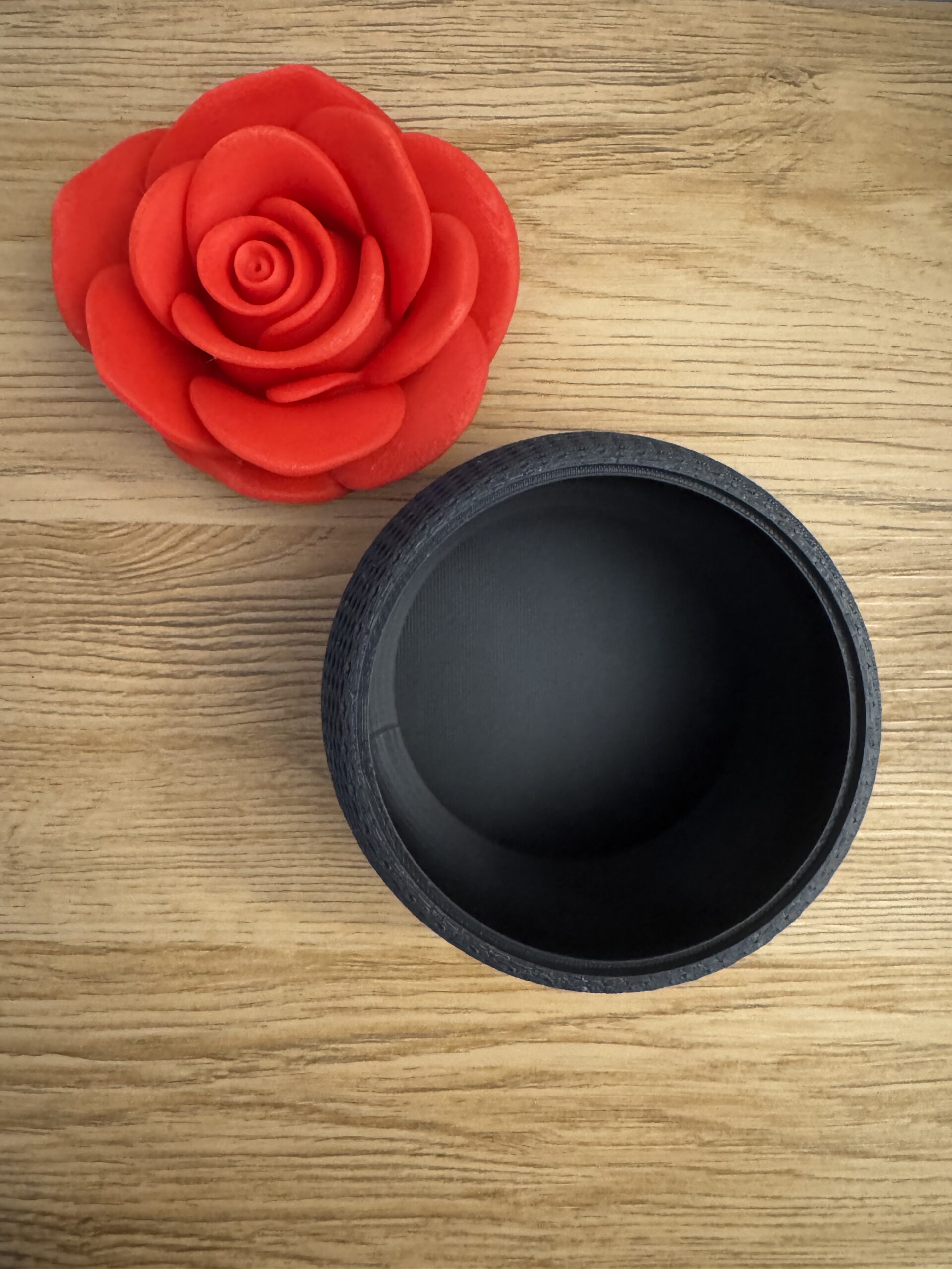 Ez a különleges, rózsa formájú prémium tárolódoboz több mint egy dekoráció: egy időtálló ajándék, amely az eleganciát és az érzelmeket egyesíti. A részletgazdagon kidolgozott, mélypiros rózsa finoman ül a modern, fekete, texturált alapzaton, luxus hatást keltve már az első pillantásra.